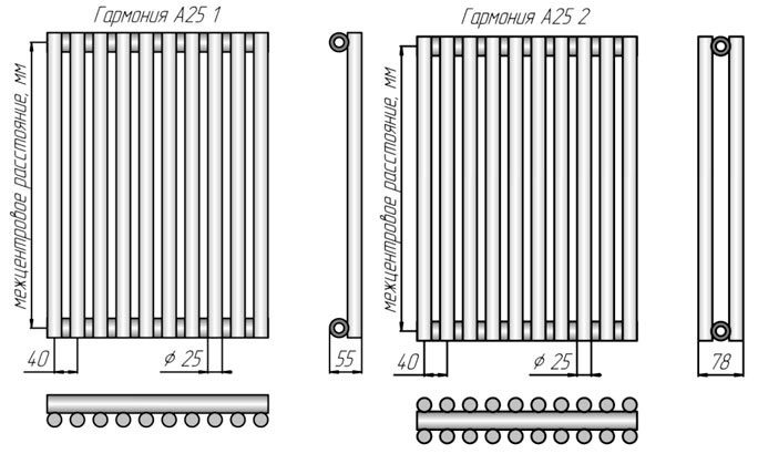 Гармония А-25 вертикальный трубчатый радиатор - состоящий из вертикально расположенных вертикальных трубок диаметром 25 мм с боковым или нижним подключением. Радиаторы можно окрашивать в любой цвет по палитре RAL в матовом или глянцевом исполнении.