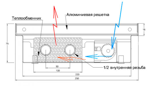 Можно заказать конвектор с цветной решеткой: Gold, Brown, Champagne, к стоимости обычной решетки нужно прибавить 10%. Возможен заказ конвектора с F- образной рамкой. Конвектор устанавливается теплообменником к окну. Такое расположение считается правильным.