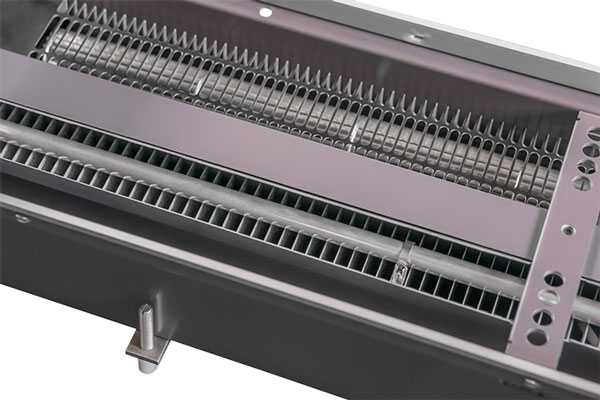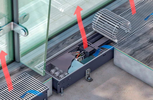 В обоих вариантах число оборотов диаметральных ЕС-вентиляторов управляется сигналом 0-10 В. При включении ЕС-вентиляторов с любым заданным значением числа оборотов активируется плавное регулирование теплопроизводительности. Для каждого варианта скорости вращения имеется соответствующая теплопроизводительность нагревательного элемента. Принцип действия: воздух из помещения забирается вентилятором и проходит через нагревательный элемент с воздухонаправляющими пластинами. Нагретый воздух выходит из встроенного в пол конвектора и поднимается вверх и обеспечивает оптимальную защиту от холодного воздуха из окна и направляет нагретый воздух в помещение равномерно, не образуя сквозняка. Разделительная пластина эффективно не допускает «короткого замыкания» между забором и выпуском.