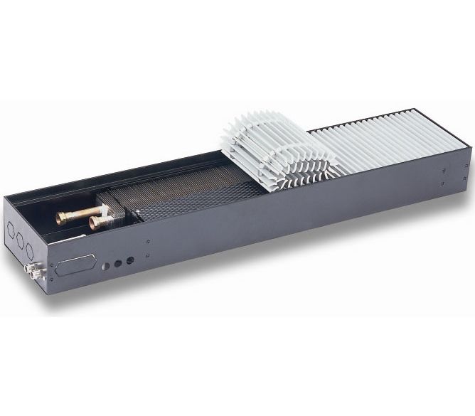 Встраиваемый в пол конвектор Klima TKV имеет встроенный вентилятор. Это отопительное устройство принудительной конвекции. В данном аппарате движение воздуха обеспечивается за счет встроенного диаметрального вентилятора. Холодная масса воздуха, которая скапливается возле основания пола, впитывается вентилятором. Далее она конвертируется в теплообменнике, а уже после нагрева поступает в комнату. Благодаря принудительному проветриванию помещение прогревается более быстро, и теплые воздушные массы равномерно распределяются по всему периметру.