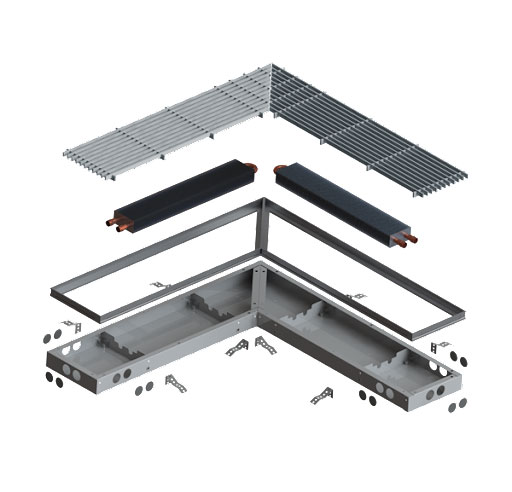 Самая простая комплектация углового конвектора с естественной конвекцией выглядит так:
