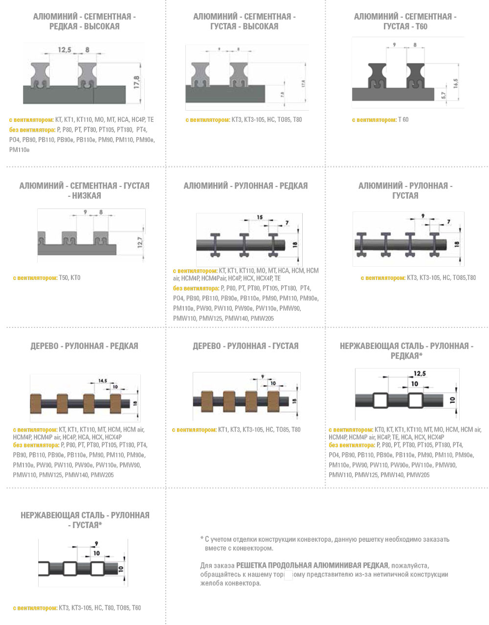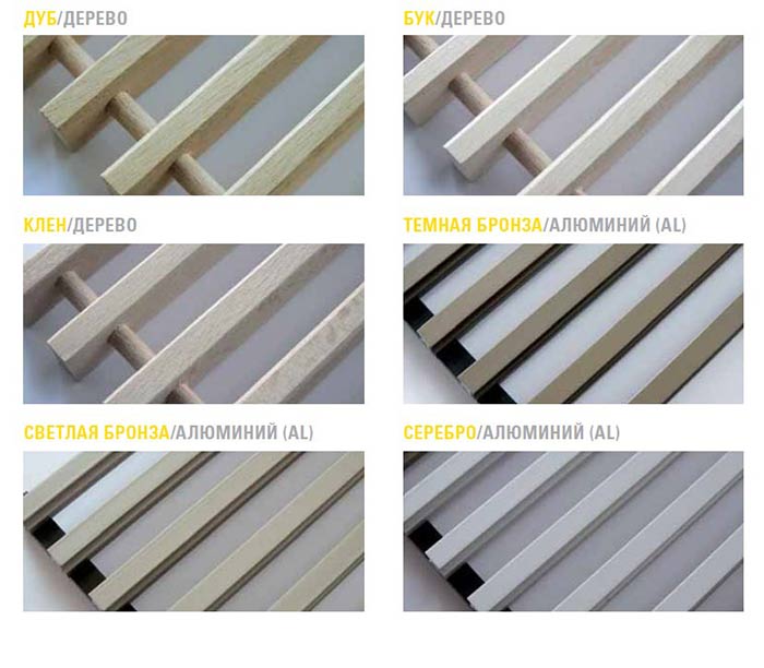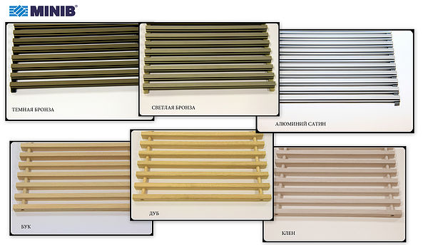Решетки для конвекторов Minib имеют большой выбор исполнения и поперечная решетка может быть покрашена в любой цвет по по палтитре RAL, у продольной решетки только стандарная палитра: темная бронза, светлая бронза, серебро.
