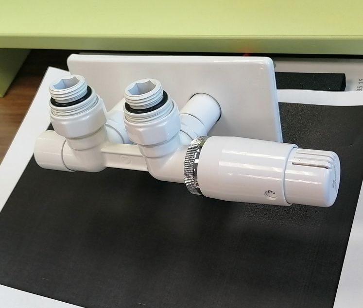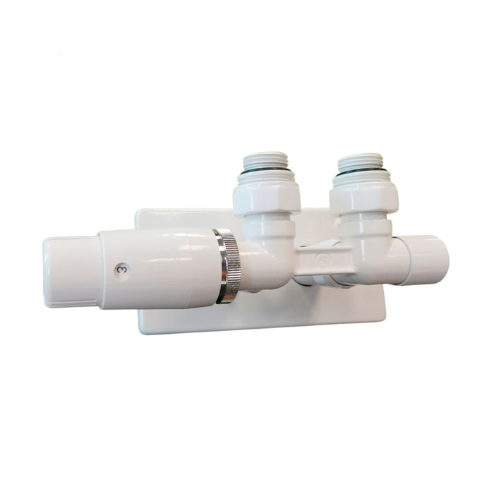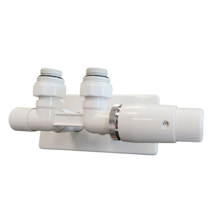 Schlosser Duo-Plex комплект нижнего подключения угловой правый белый (602100167) - это комплект для нижнего подключения радиатора отопления с межосевым расстоянием 50мм. В состав входит узел термостатический, термоголовка, ниппели 1/2х3/4.